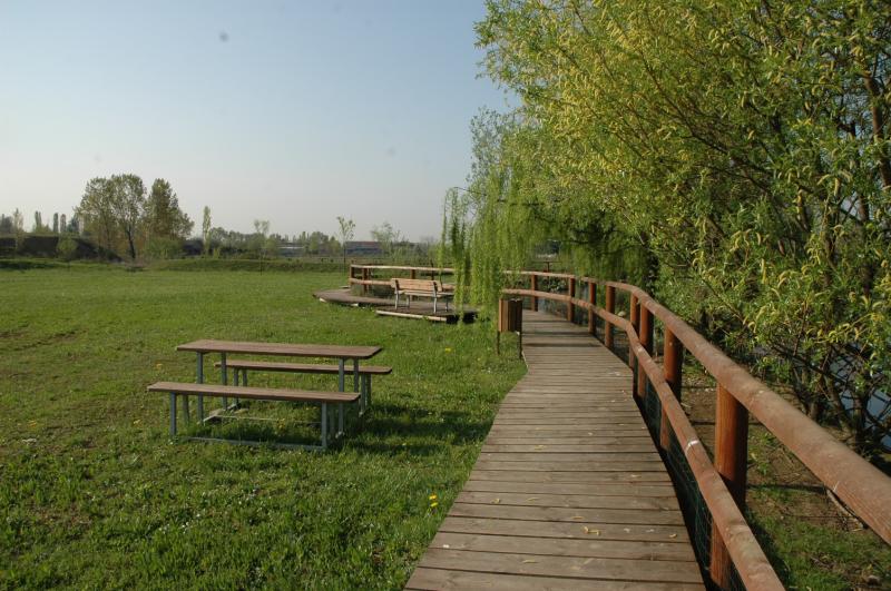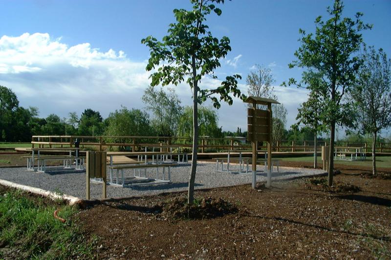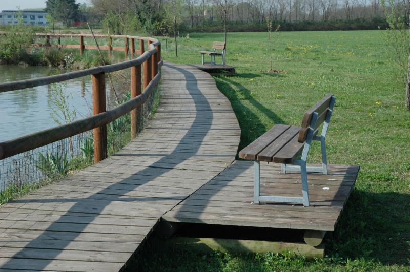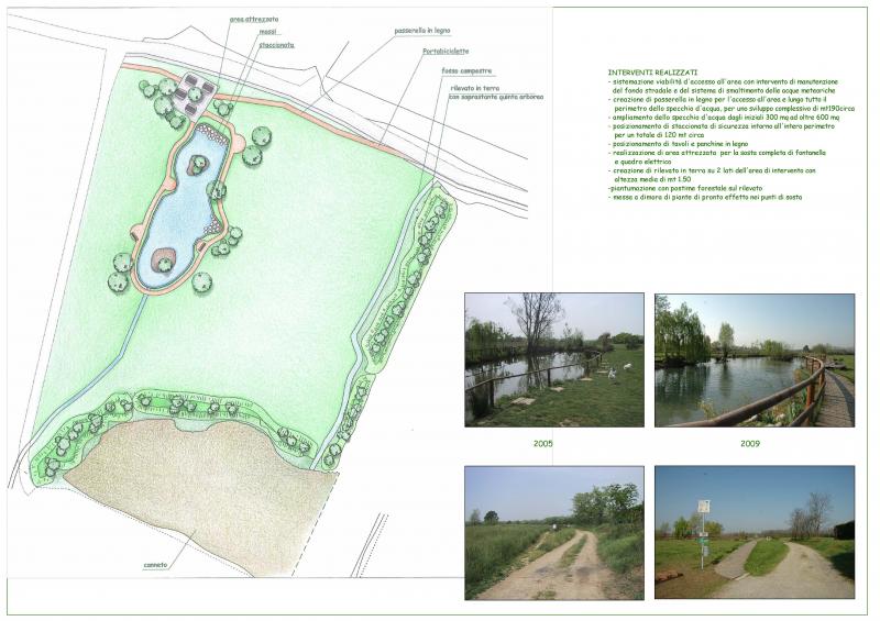 Progettazione e direzione lavori per riqualificazione area verde e specchio d\'acqua antistante con interventi di arredo urbano e piantumazione.